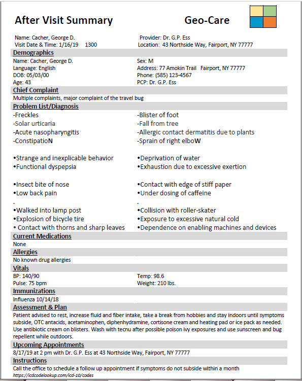 George D. Cacher went on an ambitious geocaching adventure where he wrapped up the 365-day challenge, completed his fizzy grid and also finished the jasmer challenge. He encountered all types of caches in assorted terrains and climates over the span of several weeks. Once he was back home he went to see his doctor. After receiving a thorough examination, he left the appointment with quite a few diagnoses.
