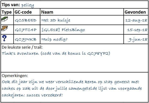 • In 2018 konden we met behulp van alle tips zelfs 2 lijsten samenstellen! Een lijst met traditionals en multi's en een lijst met andere cachetypes.