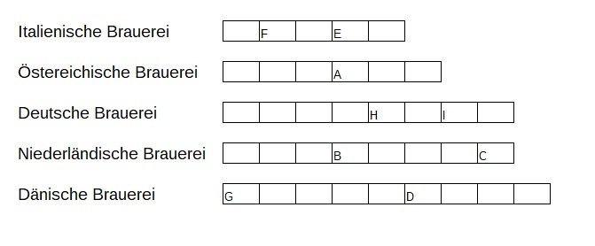Da wir in Wettelsheim auch eine Brauerei haben suchen wir in diesem Raetsel Brauereien aus Europa. Die meisten werden das eine oder das andere Bier auch schon getrunken haben. Es sind alles große Brauereien der jeweiligen Laender. Gesucht ist nur der Name. Die Buchstabenwerte dann in die Koordinaten einsetzen.