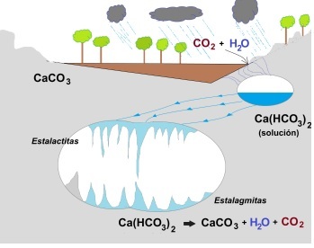 · El carbonato de calcio se disuelve en aguas que contienen dióxido de carbono gaseoso disuelto, y se forma el bicarbonato de calcio. Pero en zonas donde el dióxido de carbono disuelto se expulsa directamente a la atmósfera, ocurre que aumenta la concentración de carbonato de calcio. Esto sucede cuando aguas cargadas de CO2 llegan a la superficie del litoral, o cuando en los continentes aguas subterráneas alcanzan la superficie, dando origen a las regiones calcáreas con piedras calizas, también llamadas Carso.