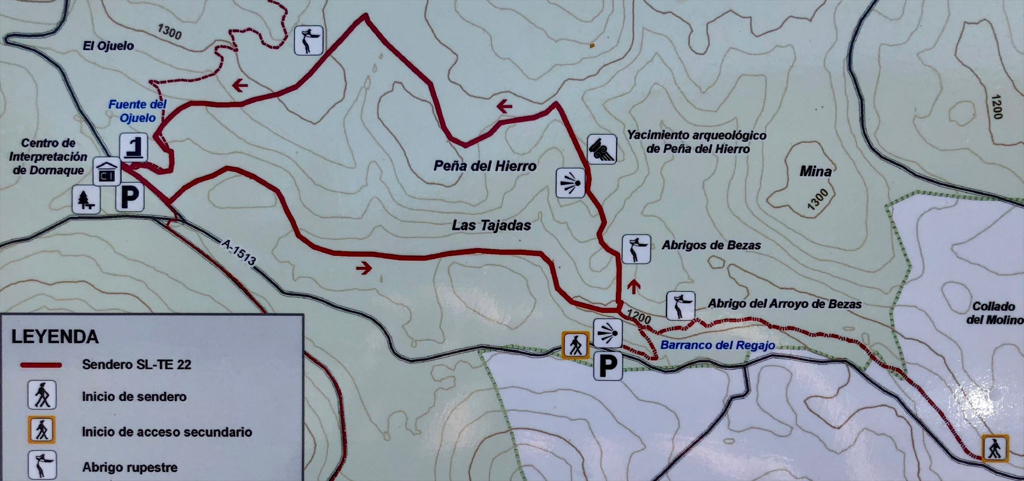 La ruta se ha pensado para empezarla desde el Mirador de las Tajadas, aunque también es posible empezar en el Centro de Interpretación de Dornaque. En ambos sitios hay parking para dejar el coche.