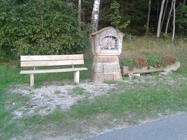 Bild / Obrázek: eine kleine Bank und eine Kapelle in der Nähe des Grenzsteines / malá lavička a kaplička nedaleko historického hraničního kamene.
