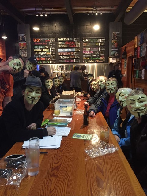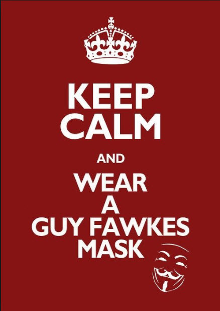 I will have Guy Fawkes masks for the first 40 attendees. Mid-event, we will take a group photo with our masks.