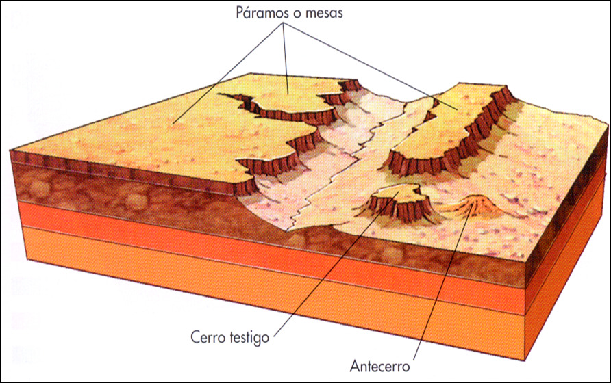 Pero en nuestro caso, prácticamente toda la provincia es un conjunto de páramos formados por el depósito de sedimentos durante el Terciario y el Cuaternario. Principalmente están formados por rocas calizas, difíciles de desgastar por la erosión. No obstante, en algunas zonas dicha erosión consiguió reducir esos páramos a cerros, que pueden presentarse aislados o bien juntos en grupo de varios.
