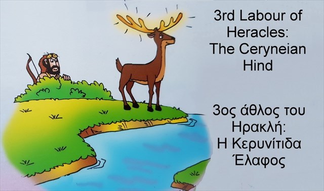 Ο τρίτος άθλος του Ηρακλή ήταν να πιάσει ένα ελάφι με χρυσά κέρατα, που ήταν το αγαπημένο της θέας Άρτεμης. Ένα ολόκληρο χρόνο προσπαθούσε να το πιάσει ο Ηρακλής, αλλά μάταια – μέχρι που μια μέρα, κοντά στον ποταμό Λάδωνα, είδε ν' αστράφτει κάτι κάτω από τον ήλιο. Ο Ηρακλής κατάλαβε ότι ήταν τα χρυσά κέρατα του ελαφιού που κυνηγούσε και του έριξε ένα βέλος, τραυματίζοντάς το ελαφρά στα πόδια. Τη στιγμή, όμως, που ετοιμαζόταν να το φορτωθεί στους ώμους του, παρουσιάστηκε μπροστά του η Άρτεμη με μάτια που άστραφταν από θυμό. Ο Ηρακλής τότε χωρίς φόβο την κοίταξε κατάματα και της είπε ότι το ελάφι της θα το πρόσεχε και μόλις το έβλεπε ο Ευρυσθέας, θα το άφηνε ελεύθερο. Έτσι η θεά ηρέμησε και τον άφησε να συνεχίσει τον δρόμο του.