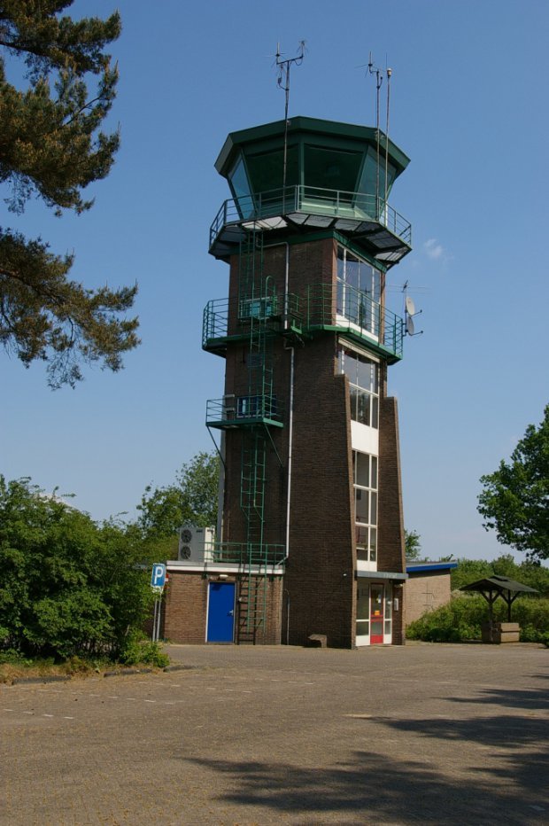 Ga terug naar je fiets bij WP 3. Daar zie je in zuidwestelijke richting onderstaande verkeerstoren uit de jaren 50 boven de bomen uitsteken. De toren bevindt zich bewust aan de zuidkant van de landingsbaan, zodat de mensen in de toren geen last hebben van de zon.