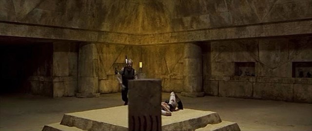 Als Leeloo [Milla Janovich] im Tempel der Elemente nach Aktivierung von Feuer, Wasser, Luft und Erde Korben [Bruce Willis] verzweifelt fragt, ob es die Menschen überhaupt verdient haben, gerettet zu werden, erklärt dieser ihr seine Liebe. Und als die beiden sich küssen, wird sie als fünftes Element aktiviert, so dass das Böse wenige Sekunden vor dem Einschlag auf der Erde durch einen Lichtstrahl gestoppt wird...