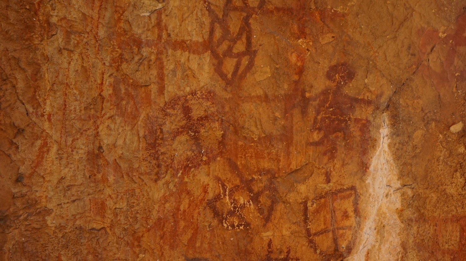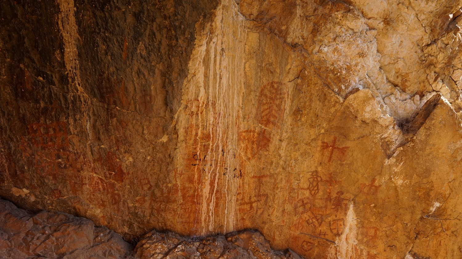 Sur les parois de l’abri supérieur, on peut observer des centaines de dessins colorés du carmin au jaune en passant par le vermillon et l’orangé. Ces dessins se composent de signes du soleil, de personnages masculins cruciformes et d’empreintes de mains inversées.