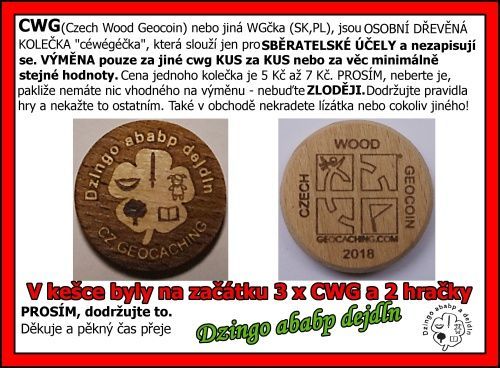 V kešce by tedy měly neustále být 3 kusy CWG. Uvidíme, jak dlouho vydrží zde. Zda zapůsobí dobré dubovo bybniční klima. Jsme velice zvědaví:o)