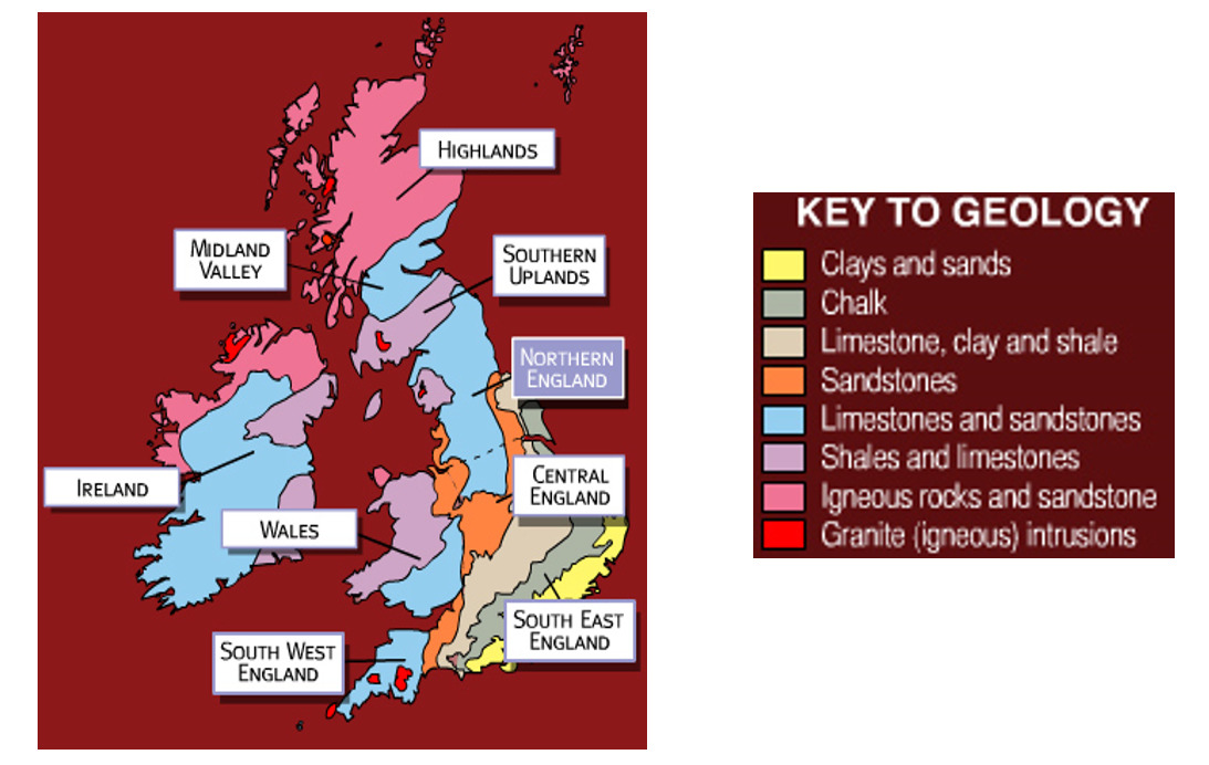 Rock types shown by region across the Britsh Isles