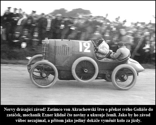 Loňského roku von Akrachowského opustil po tahanicích o peníze jeho dosavadní parťák, dlouholetý mechanik a spolujezdec Dušan Exner. Nicméně rozpory nemohly být tak vážné, když svému bývalému kolegovi Exner nechal kočírovat svoji konstrukční prvotinu, po amerikánsku sestrojený vehikl nesoucí hrdé jméno Grand Mouse. Stroj amerikánsky i vypadal, velice efektní byly výfuky, zvící velikostí rour od kamen. Poháněn byl leteckým vidlicovým dvanáctiválcem Liberty 12N o obsahu válců 27 litrů, výkonu 400 koní a plněným čtveřicí dvoustupňových šoupátkových karburátorů Seedcorp. Samotný motor vážil 4 metráky a původně byl namontován v britském bombardéru Handley Page.*