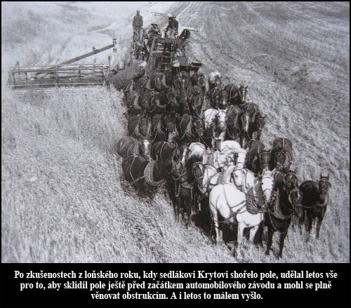 Automobilisté se nechovali ke krajině zrovna s ohledem, a to sedlák Kryta, bytostný hospodář, nemohl strpět. Rok od roku v něm kypěl vztek a loňského roku v něm bouchly saze. Na křižovatce "U topolu" se vyřítil z pole se svým volským spřežením přímo do cesty stroji řízenému čelným závodníkem von Akrachowskim. Ten ve snaze zabránit srážce strhl volant prudce do doprava a čelně narazil do pamětního kamene, postaveného zde na památku zastávky mladého Mozarta, který prý v těchto místech cestou do Prahy vystoupil a ulevil si. Rozpálený motor se vytrhl z lože a přistál ve zlatavém obilí, jež zapálil. Shořelo tehdy několik hektarů pšenice a to si sedlák Kryta dobře pamatoval. Po velkých soudních tahanicích dostal nakonec uhrazenu sotva polovinu škody. Po loňských zkušenostech letos sedlák nasadil všechny síly, své i vypůjčené, aby sklidil, vymlátil a uložil zrno bezpečně do stodoly.