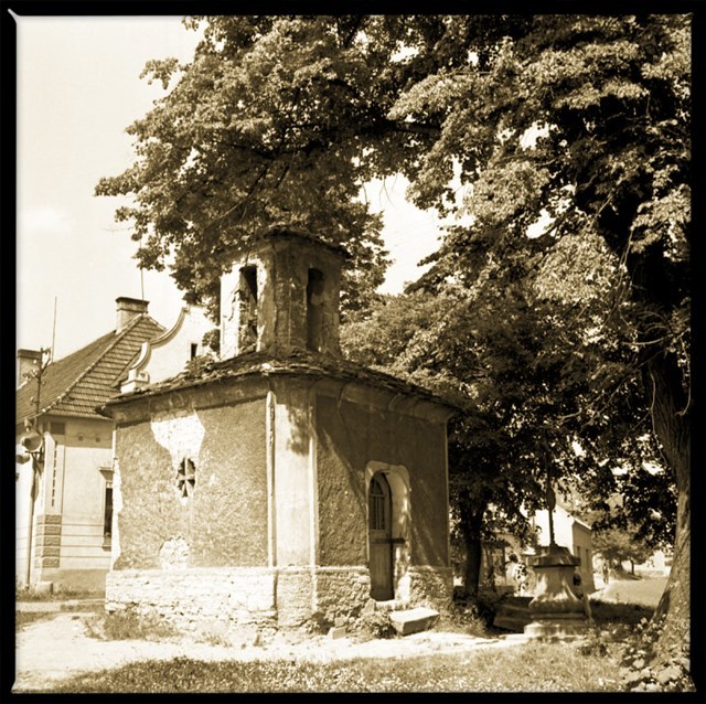 Vedle kříže, stávala ještě pozdně barokní kaple sv. Václava nebo sv. Jana Nepomuckého. Šlo o dílo pozdně barokní. Bývala to čtvercová kaple se zaoblenými rohy a zděnou zvoničkou. Interiér byl sklenut valenou klenbou s lunetami (= půlkruhová plocha stěny (tvar Měsíce ve čtvrti), nejčastěji pod valenou klenbou nad okny a dveřmi, případně malba na takové ploše. Někdy se jako luneta označuje i jakýkoli půlkruhový dekorativní útvar nade dveřmi, například tympanon). Obvodové zdivo bylo opukové, klenba nade dveřmi a stropní klenba byly postaveny z červených cihel. Střecha kaple i zvoničky byla kryta plochými taškami. Barokní zvon z litiny byl zdoben palmetami (= velmi rozšířený ornament, obvykle tvořený pěti a více na konci zaoblenými nebo zašpičatělými listy, které se vějířovitě rozbíhají vzhůru. Je souměrný podle svislé osy a připomíná korunu palmových listů. Vyskytuje se na malbách, textilu, keramice, plastikách a zejména na stavbách od starověku do 19. století) a nápisem FRANCISCUS FRANK ME FUDIT PRAGAE ANNO 1771. Na zvonu byly reliéfy sv. Václava a sv. Jana Nepomuckého, pod nimi byl nezřetelný otisk medaile. V roce 1972 byla kaple stržena a demolována. Kaple je zakreslena na katastrální mapě z roku 1840.