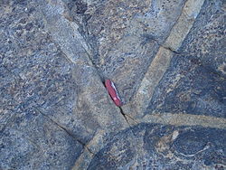 2. På hällen så finner du fler olika bergartsådror. Titta närmare på dessa. Består dessa ådror av pegmatit eller aplit och hur kan du se det?
