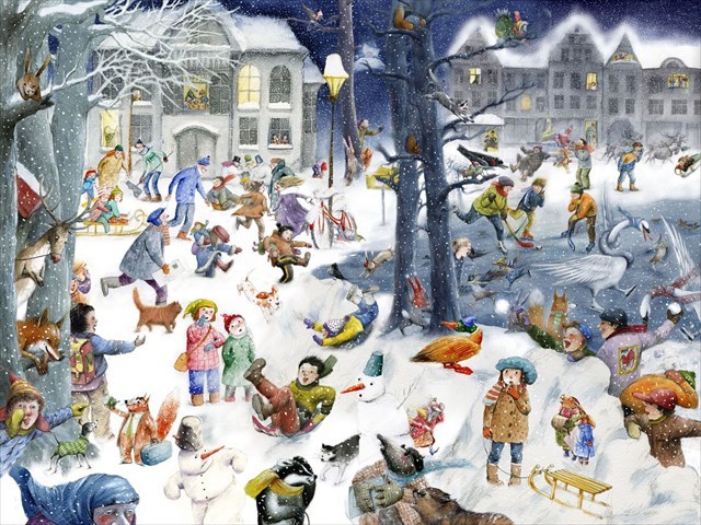 Wichtel malt seine Weihnachtskarten selbst, allerdings immer dasselbe Motiv. Bei der zweiten Karte sind ihm allerdings ein paar Dinge abhanden gekommen. Was fehlt denn? Gib alles in alphabetischer Reihenfolge in den Checker ein.