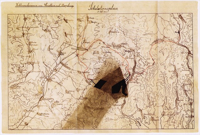 Situácia handlovsko-cigeľského ložiska, predložené Ing. Richardom Hoffmannom 9. januára 1909: - čierne plochy - overené časti ložiska,