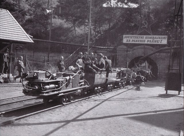 Prvý sovietsky dobývací kombajn ide slávnostne do bane, august 1952.