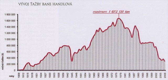 Vývoj ťažby Bane Handlová v rokoch 1909 - 2008.