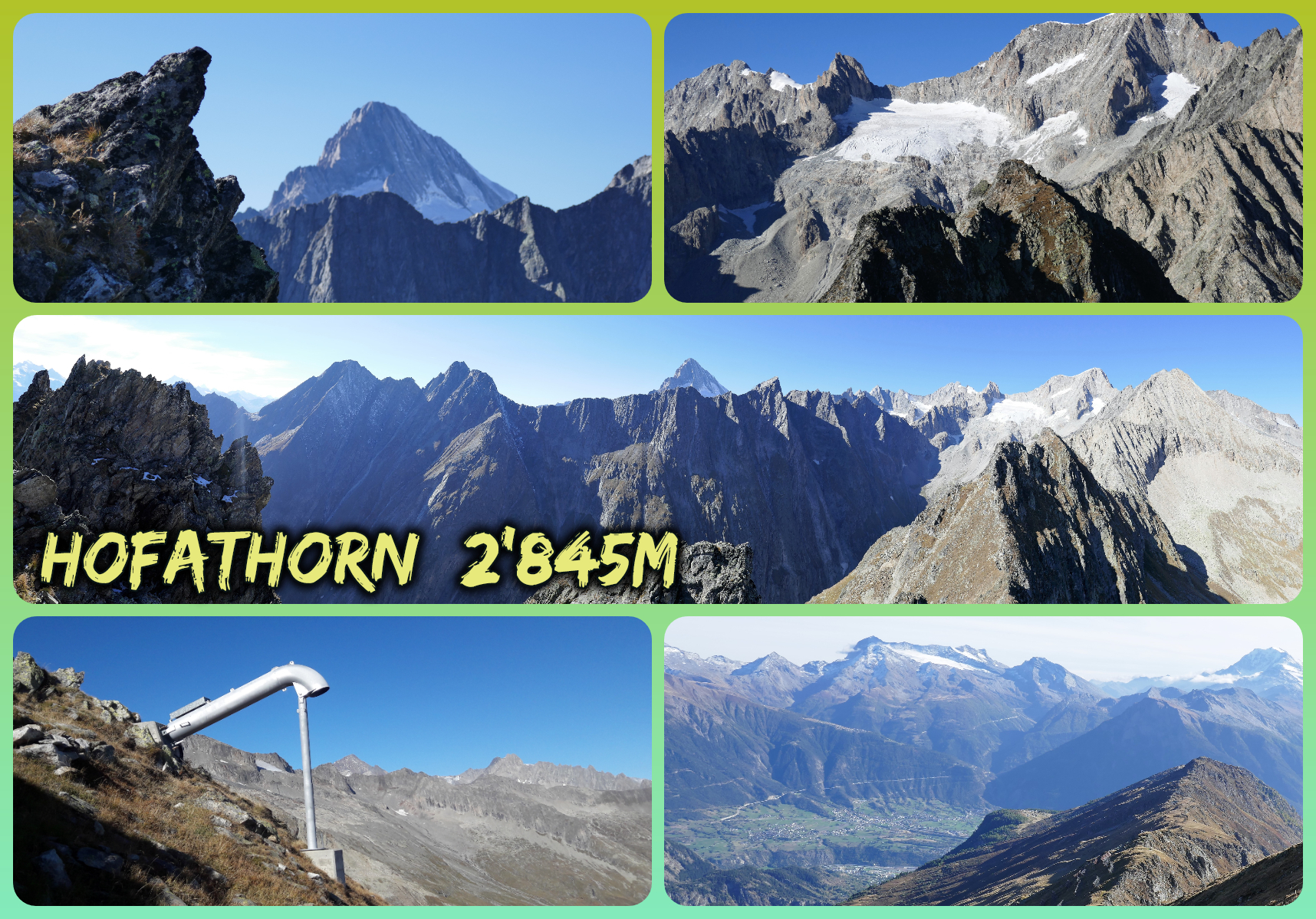 Das Hofathorn 2'845m oder auch "Schene Bärg" genannt, ist von der Belalp leicht und schnell zu erreichen; die Tour kann gut an einem schönen Nachmittag durchgeführt werden. Sinnvolle Voraussetzung ist, dass der Grashang beim Gipfelanstieg trocken ist, denn sonst herrscht durchaus Ausrutschgefahr.