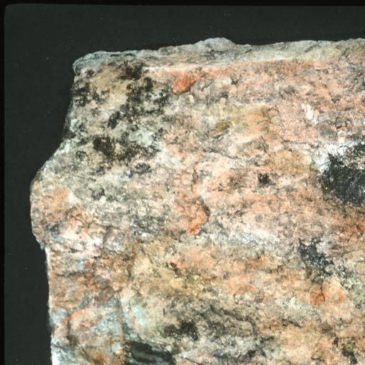 The grain size is coarse enough to allow recognition of the major minerals. The pink grains are orthoclase feldspar, and the clear to smoky grains are quartz or muscovite. The black grains can be biotite or hornblende. Numerous other minerals can be present in granite.