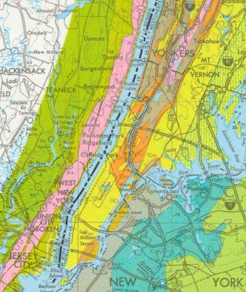 Manhattan schists (yellow), calcite marble (orange), gneiss and amphibolite (brown) and Yonkers granite and gneiss (pink)
