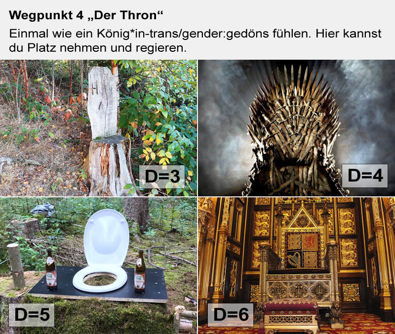 Deine Aufgabe ist es nun, die sechs vorhandenen Wegpunkte abzuschreiten und an den jeweiligen Koordinaten die Umgebung mit dem im Listing angegebenem Bild zu vergleichen. Achtung: Bei mangelnder Ortskenntnis kann das Lösen dieser Aufgabe einem Martyrium gleichkommen. Die vier Motive eines Bildes sind sich so ähnlich, dass schon der Einfluss eines anderen Lichtwinkels, einer anderen Jahreszeit oder einer anderen Anzahl an Personen im Bild die Aufgabe unlösbar machen kann. Ich habe diese Bilder Mitte Oktober bei 21° C in blauen Laufschuhen und nach zwei Spiegeleiern mit Schinken absolviert. Vielleicht hilft euch das ja ein wenig.