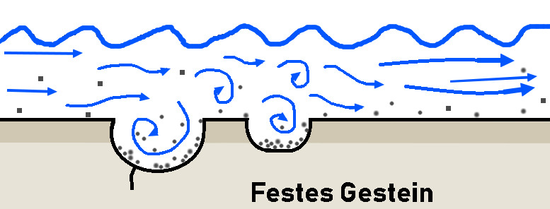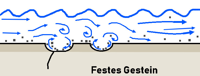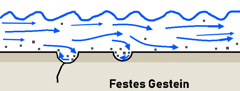 Aufgaben: 1.) Wie alt sind die Strömungskolke im Ruhrsandstein aus dem Oberkarbon? (Plakette) 2.) Stelle dich nun vor den Stein (sodass du die beiden Messing-Plaketten sehen kannst). Welche maximale Länge und welche Tiefe hat die große Rinne (Kolk) links neben der linken Plakette ungefähr? 3.) Was meinst du, sind die Kolke hier einst eher durch Klüfte im Gestein (wie in Schritt 1-4 beschrieben) oder eher durch Fließhindernisse (wie in 5 beschrieben) entstanden? Begründe ganz kurz woran du das ausmachst. 4.) Gehe nun auf die linke Seite des Steins, auf der du weitere Kolke im oberen Bereich sehen kannst. Stelle eine Vermutung an, in welche Richtung das Wasser hier einst über den Sandstein geflossen ist. 5.) Bitte füge deinem Logeintrag noch ein Bild des Ruhrsandsteins bei. Wenn du mir die Antworten über das Message-Center zugeschickt hast, kannst du sofort loggen. In der Regel melde ich mich innerhalb der nächsten Tage, aber darauf brauchst du mit deinem Logeintrag nicht zu warten.