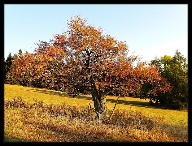 Jako velcí stromomilci, jsme si nemohli nechat pro sebe objev nádherného stromu. A také i kvůli němu vznikla tato keška. Jedná se o nejkrásnější a nejmohutnější Jeřáb ptačí (Sorbus aucuparia), jaký jsem kdy viděl. A věřte mi, viděl jsem jich velké množství ;o) a řadu jsem jich i zasadil. Jedná se o krásný solitér nacházející se kousek pod pramenem. Je možné, že Vás třeba neohromí, tak jako nás, jelikož se nemůže rovnat velikostí ani stářím druhům jako je lípa či dub, ale věřte, že je to svého druhu UNIKÁT. Jako samostatný jedinec je v takové nadmořské výšce vystaven náročnému životu – prudkým mrazivým větrům a velké množství sněhu. Nicméně se mu tu náramně daří a hledí do dáli s noblesou a majestátem. Stáří odhaduji mezi 100 – 120 lety. Stromy jsou nádherné živé organismy, které nám toho tolik dávají, a my si většinou od nich jenom bereme. Přijďte k němu a věnujte mu alespoň milý pohled či pozdrav, je to to nejmenší, co můžeme udělat.