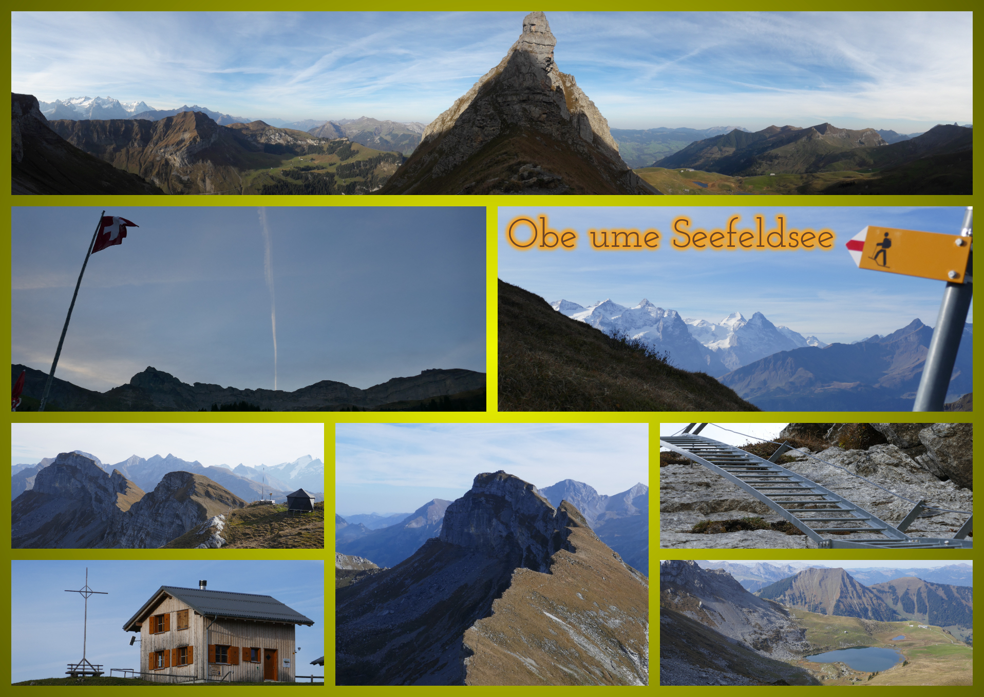 Der Multi führt Dich zuerst hoch zum Seefeld. Hier, beim Wegweiser (Frage C), kannst Du entscheiden, ob Du die Strecke im oder gegen den Uhrzeigersinn absolvieren willst. Vielleicht steigst Du die Leiter ja lieber auf als ab. Die Leiter ist auch der Hauptgrund warum der Cache die T5 Wertung bekommt. Die Europaleiter ist etwa 100m hoch. Du kannst Dich mit einem Klettersteigset jedoch gut sichern. Ansonsten ist die Wanderung ein knappes T4. Der Weg ist durchgehend und gut rot/weiss oder blau/weiss markiert. Du absolvierst auf dem Multi etwa 7.5km und 700Höhenmeter. (Ohne Abstecher zu den anderen Caches.) Für den Final oder auch um die Posten abzulesen musst Du den Weg nie verlassen!