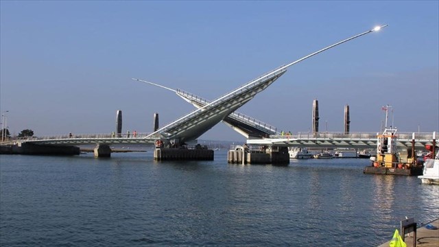 Poole, Dorset, England: Intended to operate alongside the existing Poole Bridge so that one bridge is always open for vehicular traffic; variable-message signs direct traffic to the open bridge.