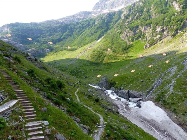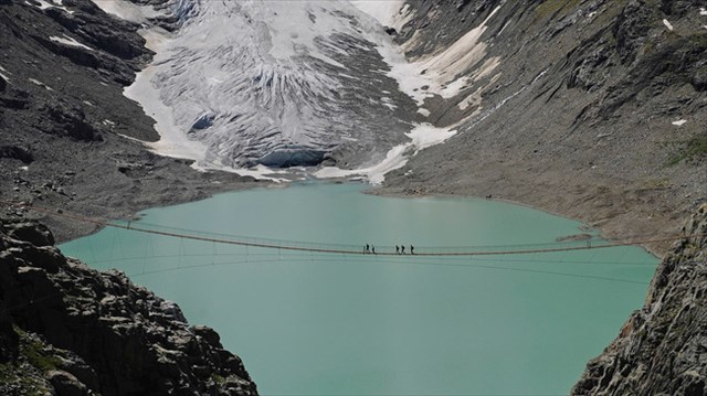 The Trift Bridge is a suspension bridge in the Swiss Alps, located above the region of the Trift Glacier. Reaching the suspension bridge requires taking a cable car, then a gondola, and then a 1.5 hour uphill hike to the bridge. In the second photo below, the beige marks are pointing fingers that were added by the photographer to show the trail that has to be taken there.