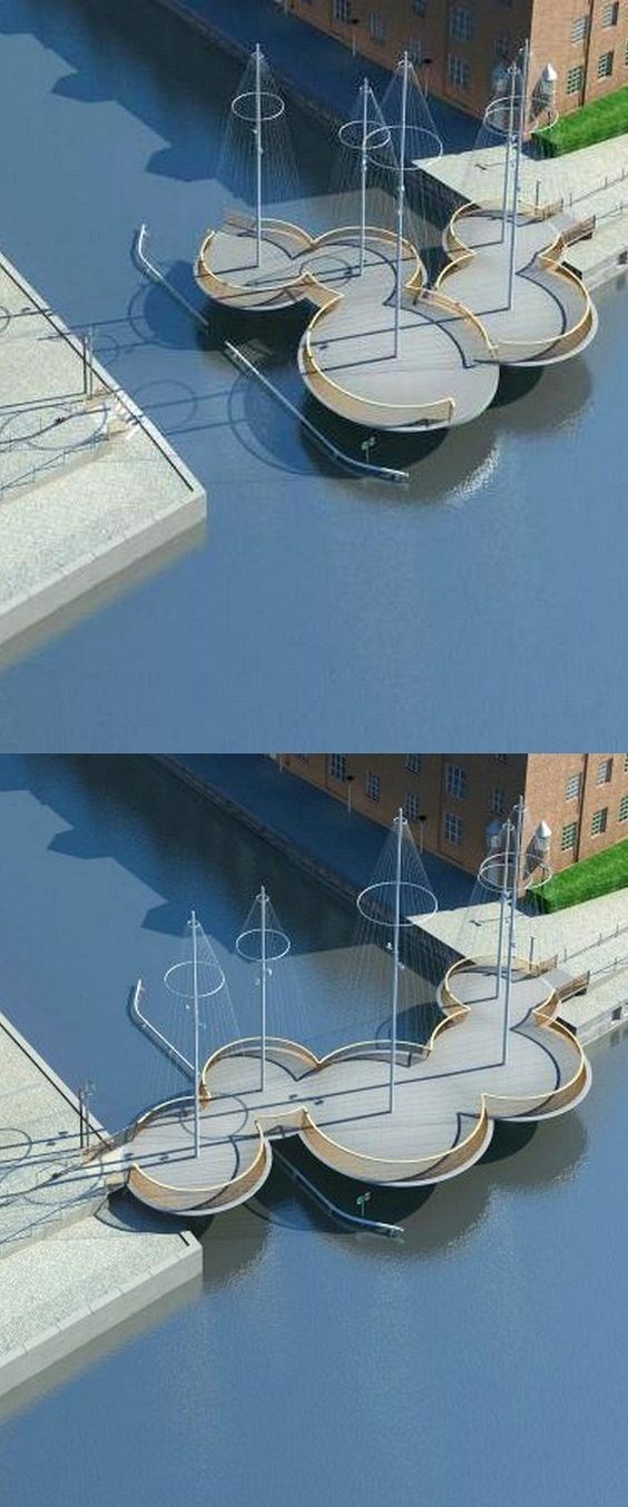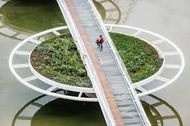Inspired by waterlilies, the Friedrich Bayer Bridge consists of two round platforms surrounded by mini gardens. The gardens are expected to reduce carbon dioxide emissions by around 300 tons per year. The center section swings away on both sides to allow water traffic to pass through. The photos shown here are an overview of the bridge; check out the nice set of photos in the link.