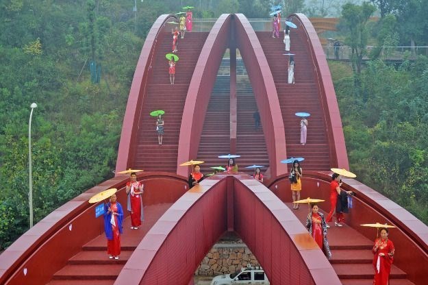 The Lucky Knot Bridge is 78 feet high above the river and connects multiple levels at different heights (the river banks, the road, the park, and the interconnections between them). The bridge was inspired by the Chinese knot. Its red color symbolizes good fortune and joy.