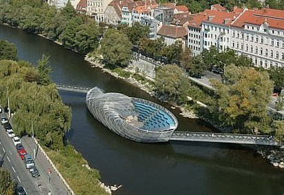 The Mur Island (Murinsel) Bridge links the two banks of the city of Graz. In addition to being a pedestrian bridge there is an ampitheater, playground and cafeteria.