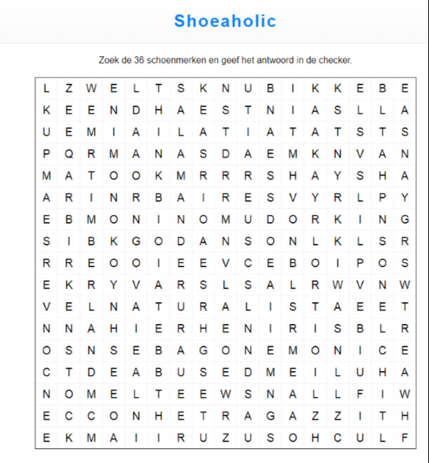 Hoezo wij hebben teveel schoenen? Ieder paar in onze kast hebben wij broodnodig! (Ja ook die drie paar zwarte pumps en vijf paar sneakers...) Zoek de 36 schoenmerken en geef het antwoord in de checker.
