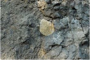 Das Foto zeigt einen kopfgroßen Sandstein-Einschluss (Xenolith) im Basalt des Kleinen Kulm. Nun ist Sandstein ja ein Ablagerungs- also Sedimentgestein und man wird sich zu Recht fragen, wie denn so ein Gestein in den Basalt kommt. Genauer betrachtet ist der massive und säulige Basalt nur rechts des Einschlusses zu sehen, links dagegen ein vielfach als Tuff bezeichnetes weicheres und feinkörniges Gestein. Diese Brekzie das Resultat einer unterirdischen (phreatomagmatischen) Explosion als heißes Magma in Kontakt mit Grundwasser kam. Zahlreiche Nebengesteinsfragmente (wie hier der Sandstein) wurden mit Asche, vulkanischem Glas, zurückfallenden Auswürflingen und Lavafetzen in dem steilen Fördertrichter (Diatrem) abgelagert.