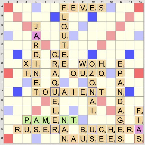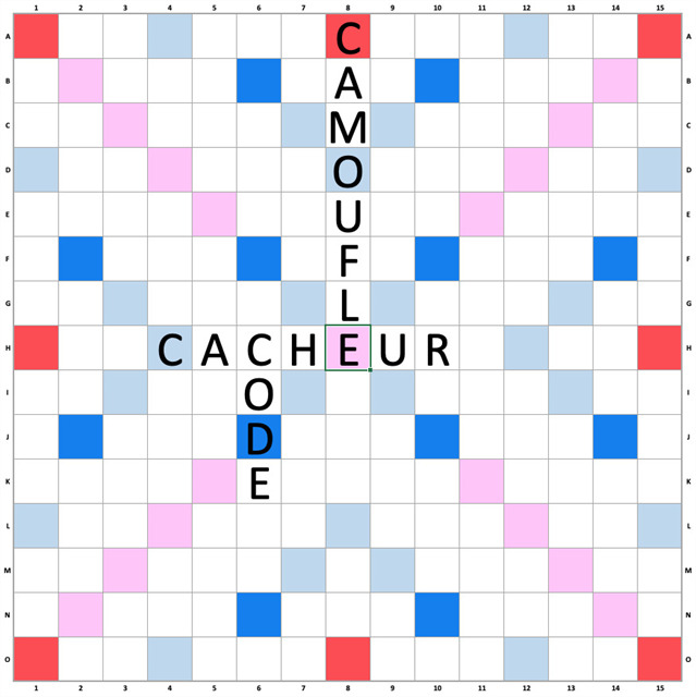 Les colonnes de la grille de Scrabble® sont numérotées de 1 à 15, les lignes de A à O. C'est l'initiale du mot joué qui indique la position du mot. La lettre (de la ligne) est annoncée en premier si le mot est joué horizontalement (ex: H 4), le chiffre pour un mot joué verticalement (ex: 4 H).