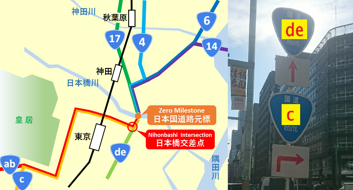 On the middle of Nihonbashi Bridge, there is the Zero Milestone of Japan and it is the starting point for seven national highways. In the section of about 200 meters from the Zero Milestone to the Nihonbashi intersection, three national highways (Route [ab], Route [c], and Route [de]) are overlapping. At the Nihonbashi intersection, they separate into Route [ab]/[c] and Route [de].