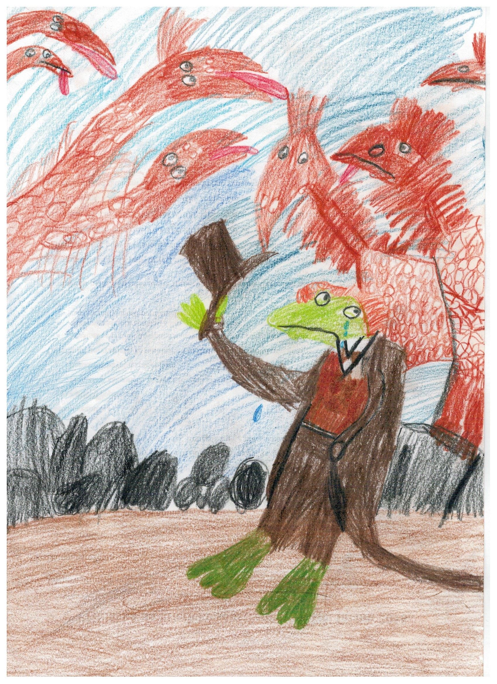 Petr se vrátil k ostatním a držel za nohu tlustého, bradavičnatého zeleného ropušáka ve fráčku, v plavovlasé paruce a s šedivým cylindrem v ruce. Petr ho položil na zem a tam se teď před nimi krčil, polykal naprázdno a nervózně po nich těkal vyboulenýma žlutýma očima.