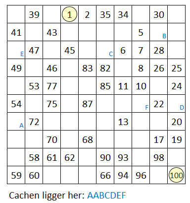 Felterne skal fyldes med tallene fra 1 til 100 i fortløbende rækkefølge. Tallene kan forbindes lodret, vandret og diagonalt.