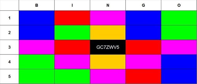 Ziehung: 3x pink und dann abwechselnd blau, grün, pink bis ein Bingo Kreuz erzielt wird