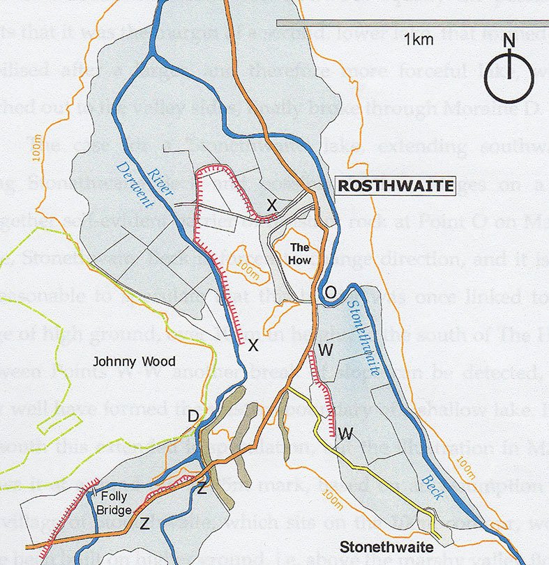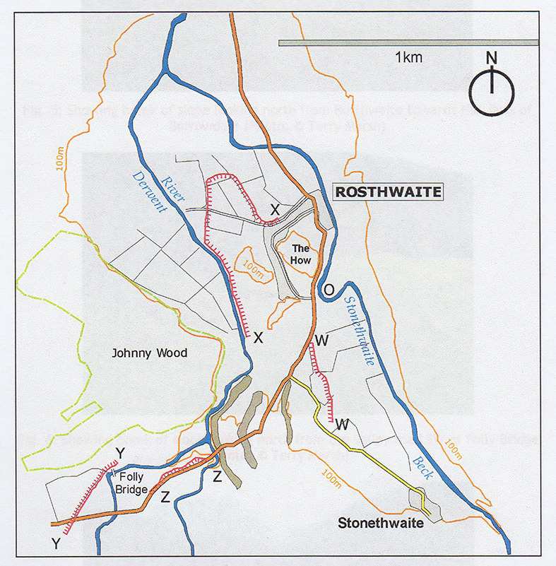 The extent of these Borrowdale ‘lakes’ is not clear, but there is clearly defined high ground on which Rosthwaite is built, and a well-defined break of slope (X-X), which may well have formed the margins of the lake.