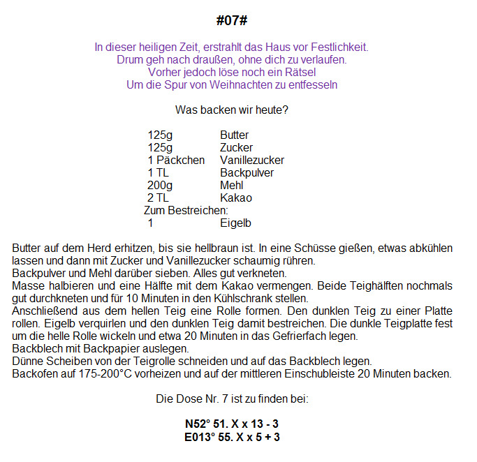 Hier ist nun Schluss. Der Cacheadventskalender 2018 wird nun geschlossen. Daher ist " Auf der Suche nach Weihnachten #07#" nun nicht mehr findbar, denn der Cachebehälter wurde entfernt.