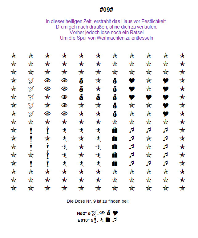 Hier ist nun Schluss. Der Cacheadventskalender 2018 wird nun geschlossen. Daher ist " Auf der Suche nach Weihnachten #09#" nun nicht mehr findbar, denn der Cachebehälter wurde entfernt.