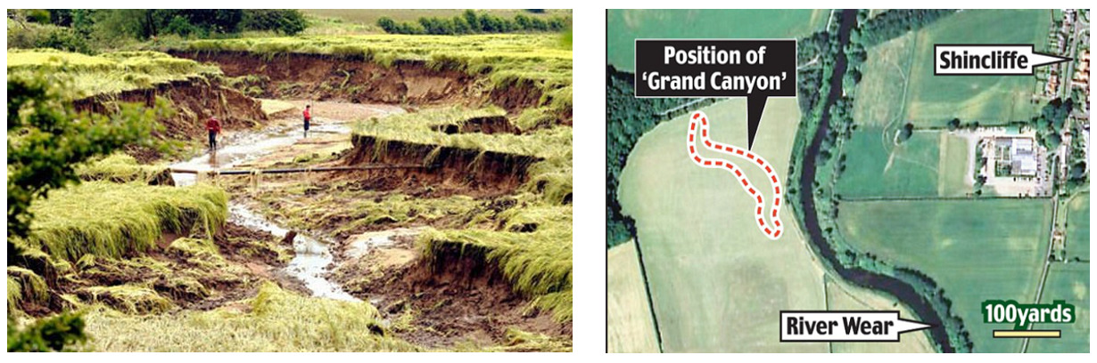The floods of 2009 created quite a bizarre phenomenon that was dubbed locally as the 'Grand Canyon of Durham'. A large trench was cut out by floodwaters near to Durham city and measured 80ft at its widest point, 14ft deep and several hundred metres in length!