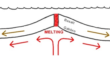 It is often stated that Earth's oceanic crust is made up of basalt. The word "basalt" is used because the rocks of the oceanic crust have a "basaltic" composition. However, only a thin surface veneer of oceanic crust is basalt. Gabbro forms at depth from slow crystallization. The deeper rocks of the oceanic crust are generally coarser-grained gabbro. Basalt occurs at the surface of the crust because the rocks there have cooled quickly. At greater depth the cooling rate is slower, and large crystals have time to develop.