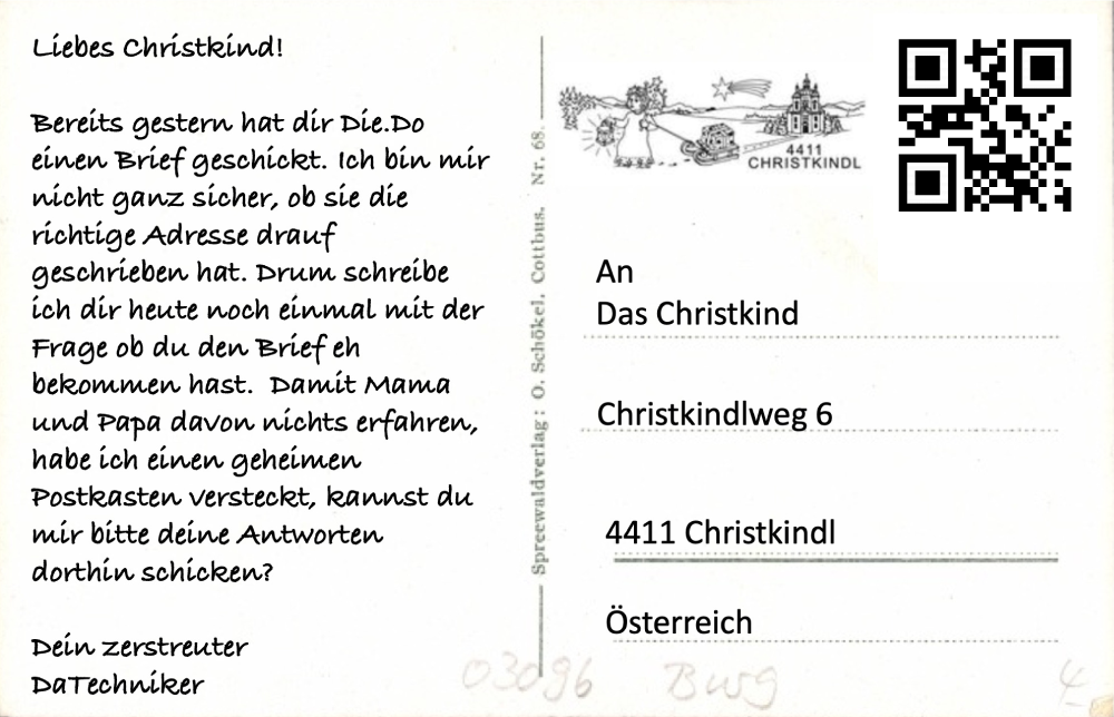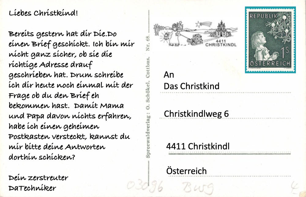 Auch wir werden mit der Zeit immer zerstreuter. Kurz vor Weihnachten ist so viel los und noch so viel zu erledigen. Es wäre also an der Zeit einmal nachzufragen, ob das Christkind eh unseren Wunschzettel bekommen hat. Hoffentlich bekommen wir eine Antwort auf unsere Frage.