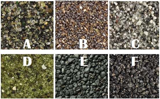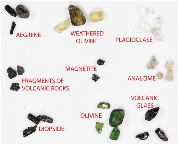 Olivine, pyroxene, and magnetite are the most characteristic minerals of most volcanic sand deposits. Most volcanic beach sands are dark-colored. Hence, they are often named black sand. Black color is given to these sands by minerals augite (pyroxene), magnetite, and sometimes hornblende. These minerals contain lots of iron in their crystal structure which often gives them black color and reddish rust-colored hue when weathered.