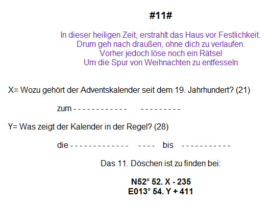 Hier ist nun Schluss. Der Cacheadventskalender 2018 wird nun geschlossen. Daher ist " Auf der Suche nach Weihnachten #11#" nun nicht mehr findbar, denn der Cachebehälter wurde entfernt.