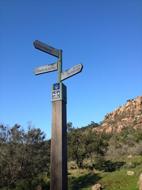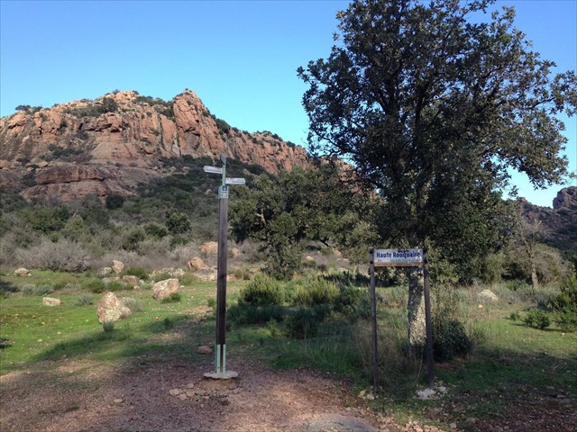 Passage incontournable au rocher : le carrefour de Haute Rouquaire. La vue y est magnifique (comme partout autour du rocher). Depuis cet endroit, comme le panneau l'indique, vous pouvez partir en direction de la Draille du Facteur, qui permet d'aller vers les monolithes des Deux Frères ou encore vers le logis de l'ermite. Vous pouvez aussi partir en direction des Trois Croix (à 1h de marche). D'ailleurs on peut apercevoir les croix d'ici : tout en haut du rocher sur la droite du panneau.